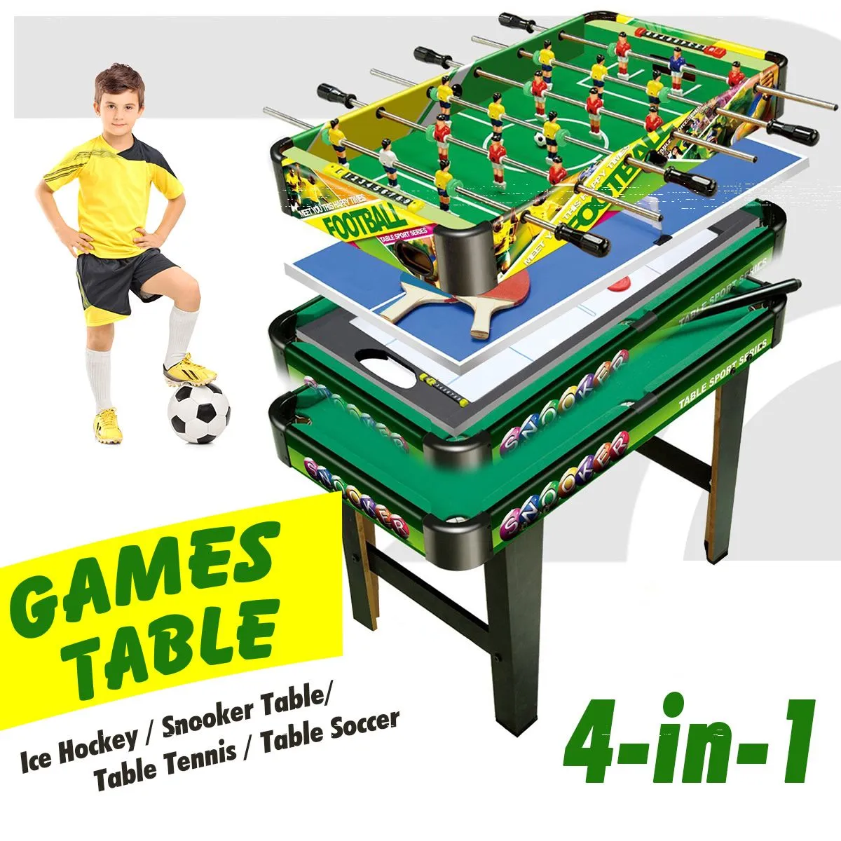 This 4-in-1 wooden games table delivers fun for everyone! It neatly combines foosball, table tennis, air hockey, and pool in one space-saving unit. Simply stack or separate the game boards to switch activities instantly. Everything is stored together, keeping your home clutter-free for endless family entertainment.