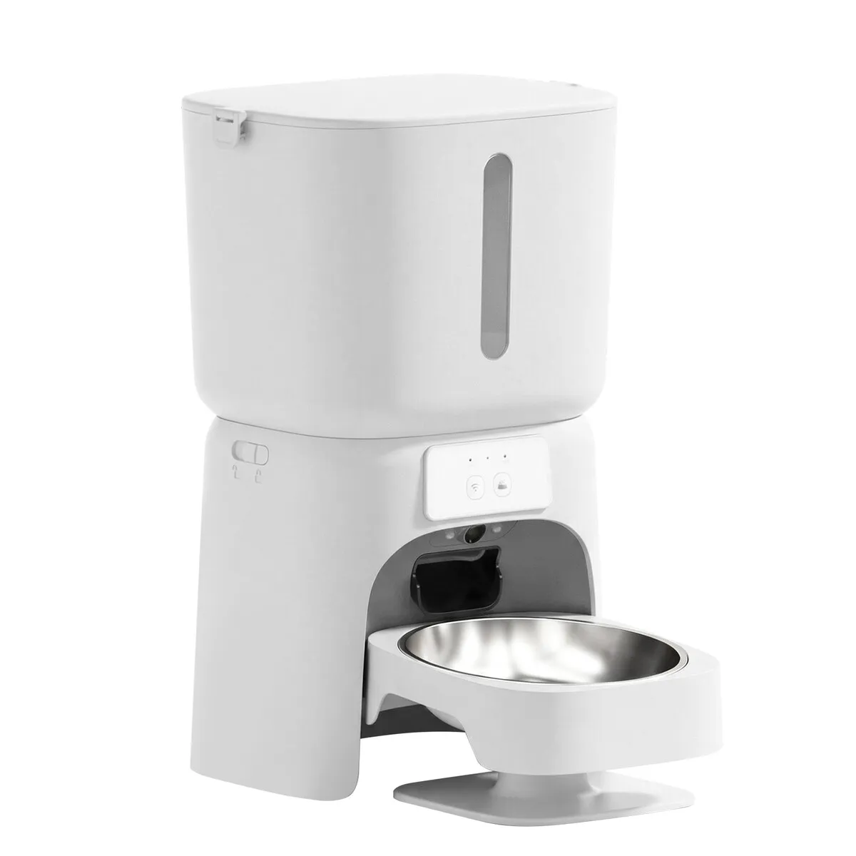 Stay connected with your pet using this Automatic Feeder with Camera. Features include 1080P HD live view, two-way audio, custom schedules, a 6L capacity stainless steel bowl, WiFi-free operation, dual power backup, airtight storage, and smart notifications—ensuring your pet is fed, comforted, and cared for anywhere.