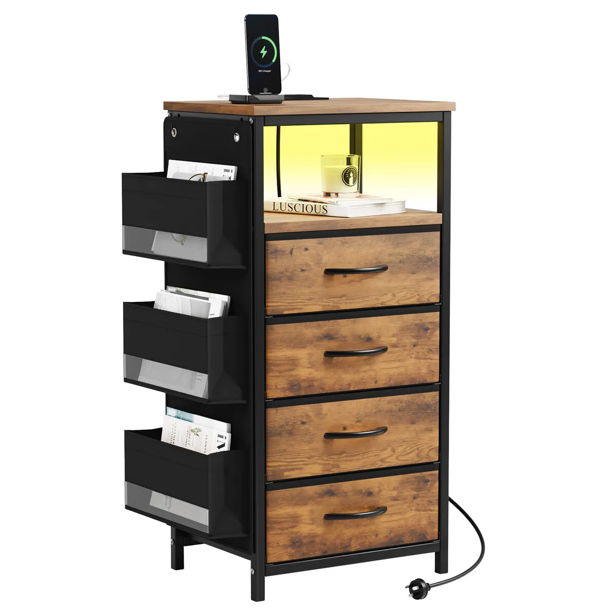 #3 Click to Buy 56% Off Sale on Bedside Table Dresser Chest LED Nightstand Lamp End Cabinet Stand Unit Storage Drawers Shelf Fabric Bags Wooden Bedroom Furniture USB Charging Station