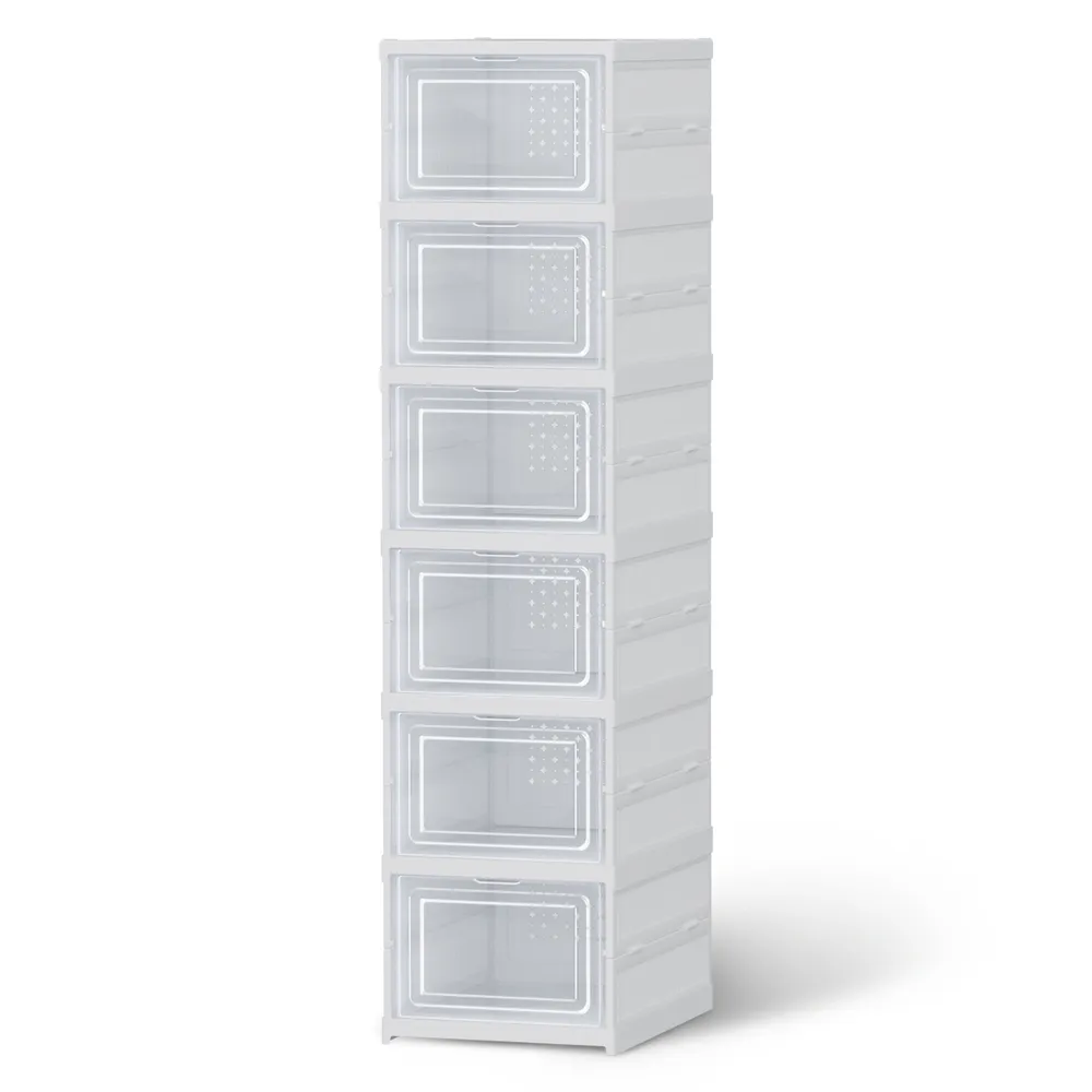 You can maximise your space with the Artiss 6-tier shoe rack, which is crafted from durable PP plastic. Its foldable design features breathable back flaps and see-through doors with raised handles for easy access. Each compartment holds up to 2.5 kilograms. This rack is perfect for small homes. It measures 25.5 by 34.5 by 105 centimetres and comes in white.